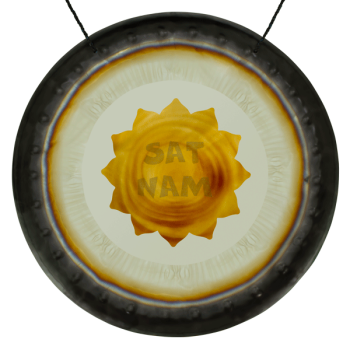 Gong sinfónico de 22 pulgadas con el símbolo Sat Nam grabado en un mandala de flor sobre un fondo ardiente de fuego. Una herramienta sonora y visual para el despertar interior y la expansión del alma.