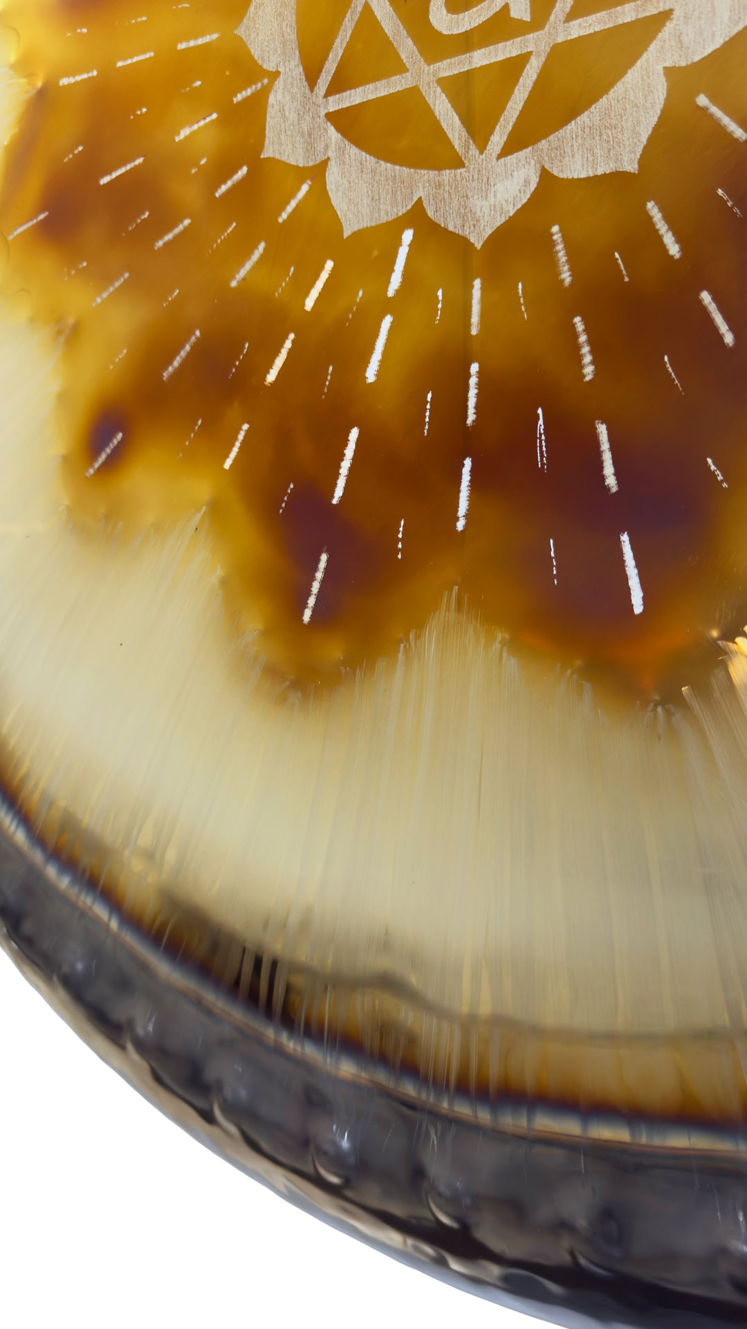 Cada línea, cada marca y cada quemadura del metal hablan de transformación. Este gong no fue diseñado solo para ser tocado, sino para despertar. El tono profundo que emite atraviesa el cuerpo físico, limpia el campo energético y resuena en lo más profundo del alma. El símbolo de Anahata permanece grabado en un fondo rayado y quemado, intensificando su poder de apertura emocional y conexión interior.