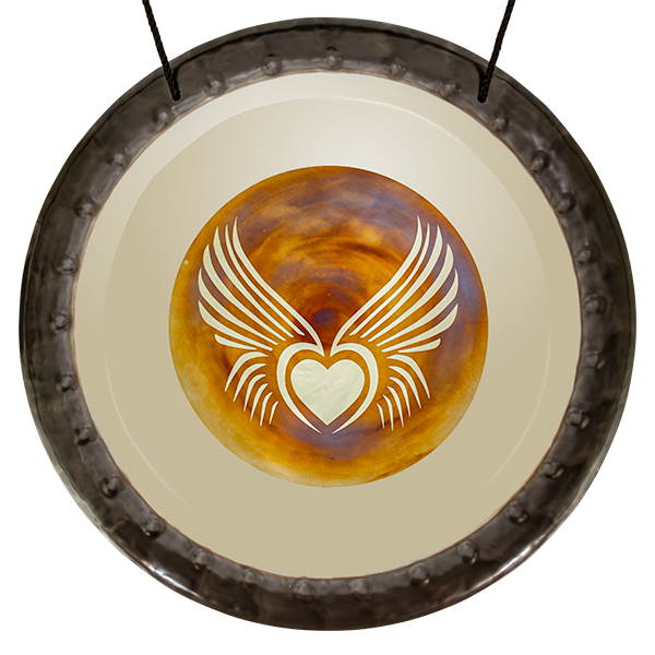 Gong de 22 pulgadas con corazón alado grabado en el centro. Fondo pulido efecto espejo. Ideal para meditación, sanación y apertura del chakra corazón.