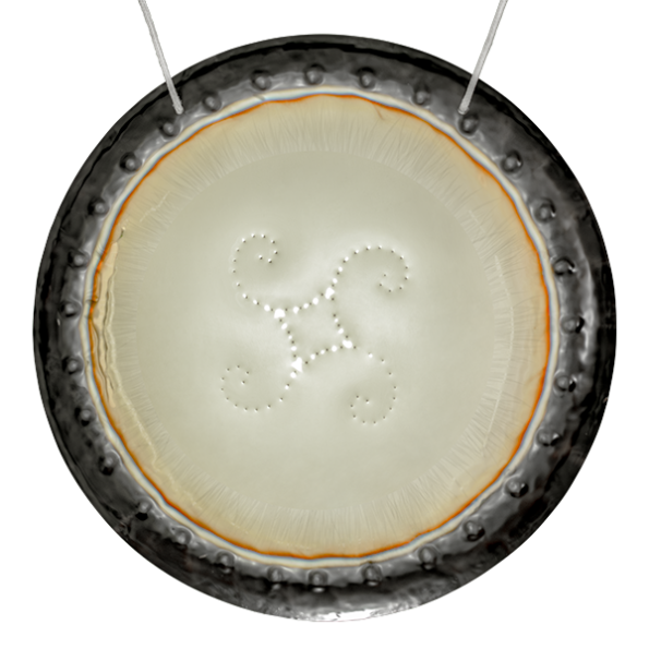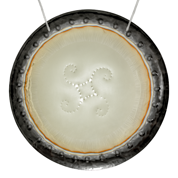 Gong con cuatro espirales de Fibonacci conectadas, forjadas en puntos martillados sobre un fondo pulido efecto espejo. Canaliza equilibrio, expansión y conciencia cósmica.
