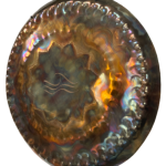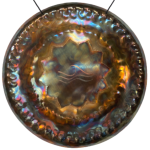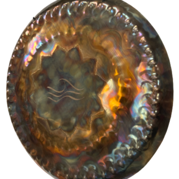 El Gong Oceánico de 22 pulgadas con su acabado de metal quemado es una pieza única y orgánica, donde los elementos del fuego y el agua se encuentran. El metal forjado y transformado por las llamas se convierte en un espejo de los reflejos del mar, con colores que van del dorado al azul profundo.