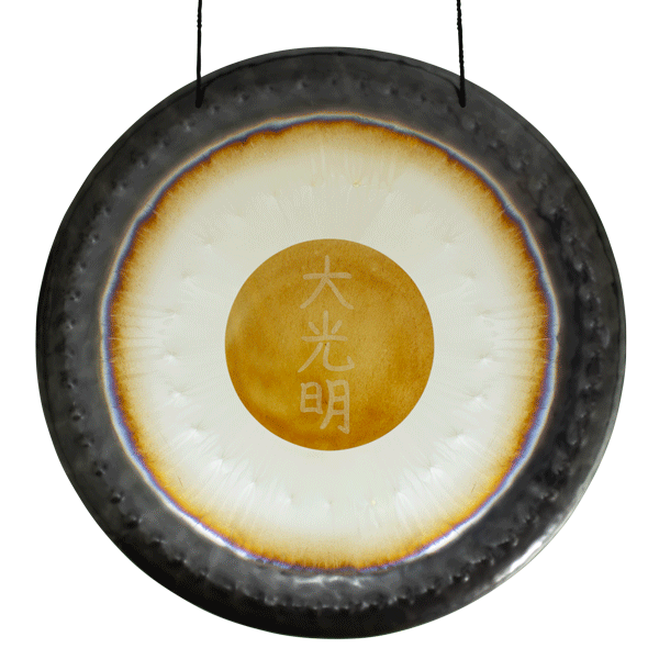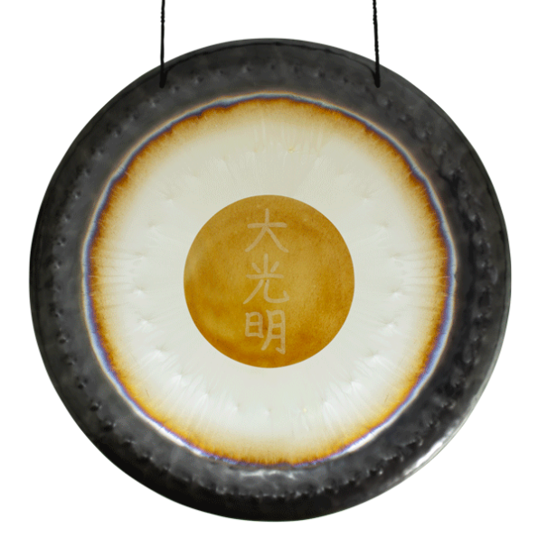 Gong sinfónico con símbolo Reiki Dai Ko Myo en círculo de metal quemado. Sonido espiritual y armónico para sanación, Reiki y meditación.