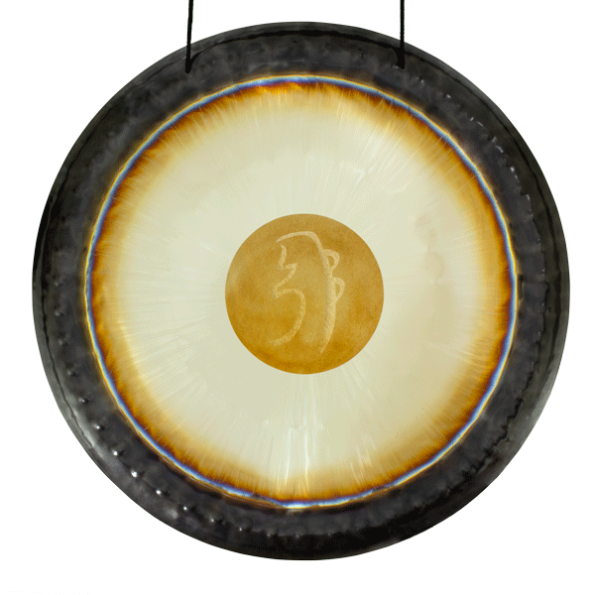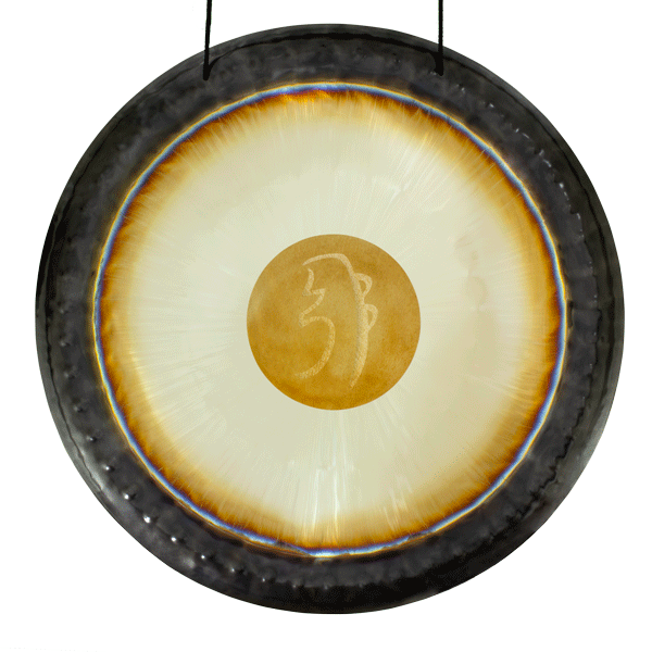 Gong sinfónico de 22” forjado en metal quemado con símbolo Om integrado. Sonido armónico y espiritual, ideal para meditación, limpieza energética y sanación vibracional.