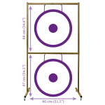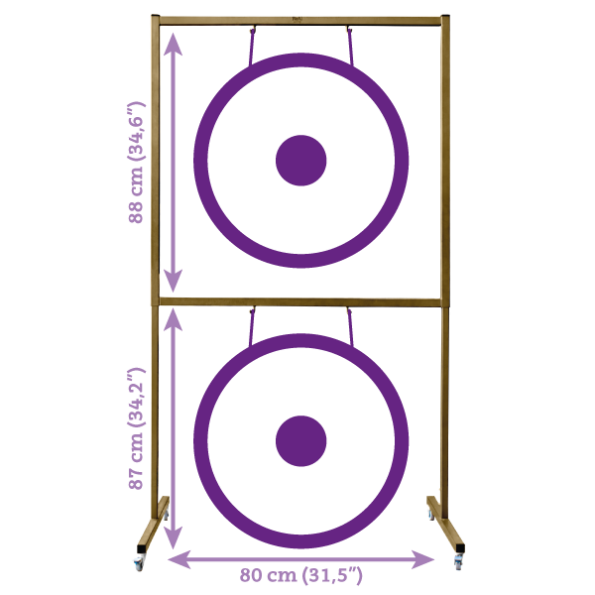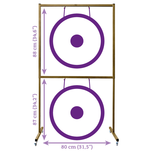 Este soporte dorado para gong es una invitación a elevar la experiencia sonora a un nivel superior. Con un diseño doble robusto, fabricado en acero de alta calidad, su estructura pintada en horno con un tono dorado sutil pero radiante, refleja la luz de manera armoniosa, creando un espacio sagrado para el gong. Su sistema telescópico y una anchura libre hasta 80 cm (31,5″), ofrecen una versatilidad única para gongs de hasta 65 cm (26″). Tiene una altura del soporte superior de 88 cm (34,6″) y altura máxima del soporte inferior de hasta 87 cm (34,3″). Esta funcionalidad favorece tanto a músicos como a terapeutas del sonido, facilitando su práctica diaria.